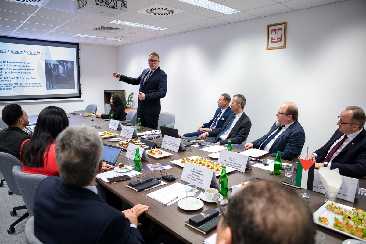The meeting was attended by Minister Majdi Khaldi, senior diplomatic advisor to Palestinian President, His Excellency Omar Awadala, Ambassador and Assistant Minister for Multilateral and United Nations Affairs at the Ministry of Foreign Affairs of Palestine, His Excellency Mahmoud Khalifa, Ambassador of the State of Palestine to Poland, Alaa Jadallah, Second Secretary of the Embassy of the State of Palestine in Warsaw and Ammar Shayeb, Director of the Office of the Embassy of the State of Palestine in Warsaw.
