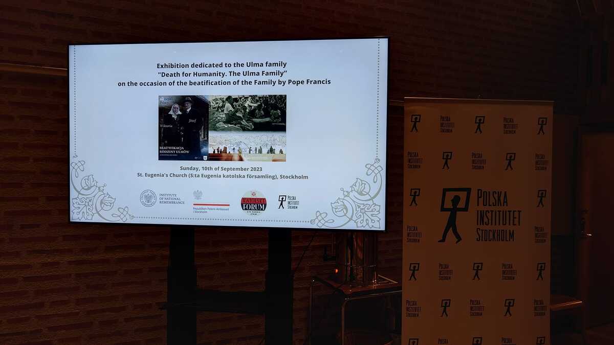 On September 10, an exhibition entitled "Death for Humanity" was unveiled at St. Eugenia Catholic Parish in Stockholm in order to popularize the beatification of Józef and Wiktoria Ulma and their seven children. Numerous guests who attended the event in Stockholm had the opportunity to see an IPN documentary about the Ulma family followed by a lecture of Prof. Marek Wierzbicki from the IPN Historical Research Office and a debate led by Artur Szulc. Prof. Wierzbicki described a broad context of the situation of Poland during World War II focusing on the Holocaust and the attitudes of Poles who faced the extermination of Jews.