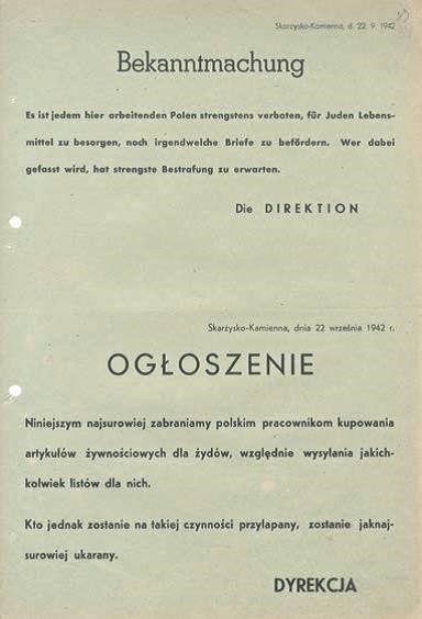 This type of factory hired Jews, imprisoned in labor camps, and Poles known as "free" workers. However, the Poles faced deportation to forced labor camps in Germany in case they did not want to work. Tadeusz Nowak was one of the Polish workers in Skarżysko-Kamienna. He worked as a locksmith, and at the same time, as a soldier in the resistance Home Army, he smuggled ammunition to fight against the Germans. Despite the death penalty announced by the occupiers for even the lightest help to Jews, Nowak and his group were delivering food and letters to Jewish prisoners. Just before the Easter of 1943, Tadeusz Nowak was caught providing such assistance by the German security service (Werkschutz). On 21 April he was sentenced to public execution by hanging. During the execution the rope broke, so the Werkschutz commander shot death the Polish brave man on the spot. Tadeusz Nowak's body was hung on the factory gate in order to scare off other workers. According to some witnesses, a plaque with the inscription "This Pole gave bread to Jews" was mounted on it.