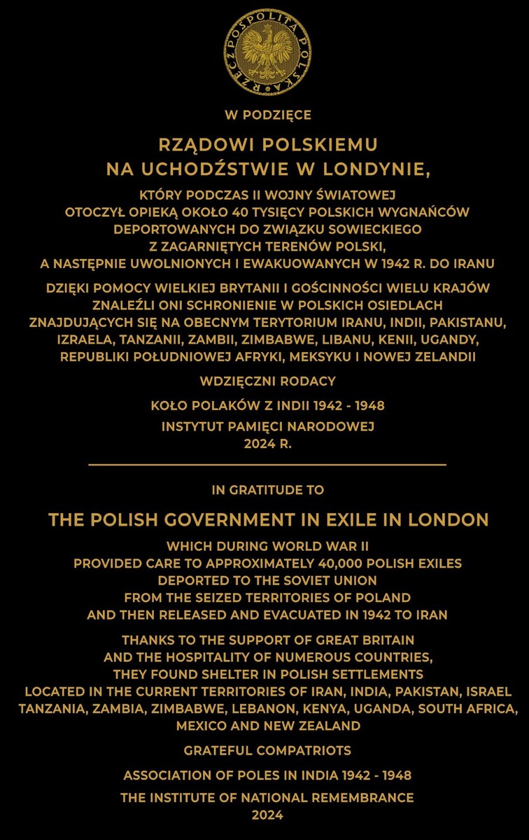 On 3 July 2024, at the Temple of Divine Providence in Warsaw, representatives of the Institute of National Remembrance and the 1942-48 Circle of Poles in India unveiled a plaque commemorating the activities of the Polish Government in Exile in London, which during World War II provided care and assistance to approx. 40,000 Polish citizens deported to the Soviet Union from the Polish territories seized in 1939.