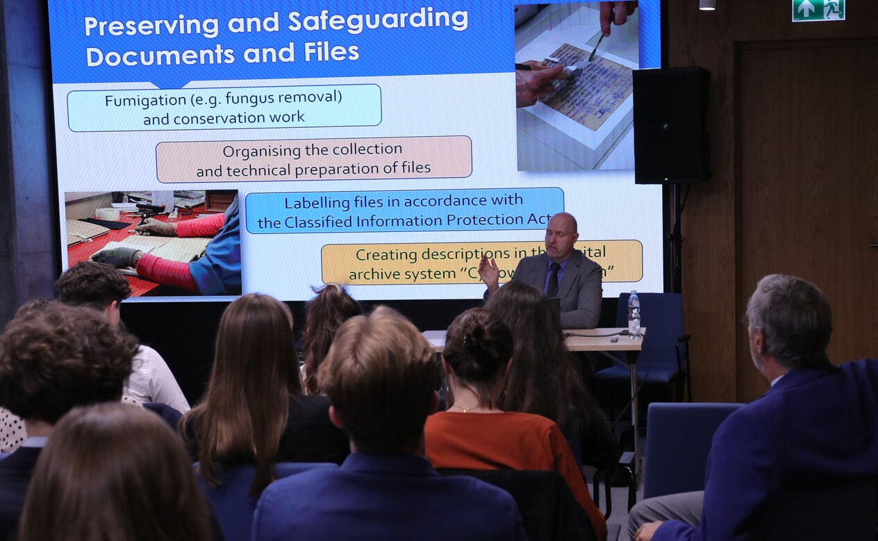 During the meeting, representatives of the IPN presented the wide range of the Institute's activities. The guests were welcomed by the Deputy Director of the IPN's Office of International Cooperation, Mateusz Marek, Ph.D., after which Sławomir Bardski presented the mission, tasks, and structure of the Institute, its role in commemorating and researching Poland's 20th century history, and the international projects carried out by the Office. Rafał Michliński from the IPN's Office of Search and Identification familiarized the guests with the unit’s activities, including search, identification, and commemoration of victims of totalitarian repression. Prosecutor Robert Janicki discussed the competences and activities of the Chief Commission for the Prosecution of Crimes against the Polish Nation, including criminal proceedings concerning communist and Nazi crimes. Marcin Majewski from the IPN Archives presented the Institute's archival resources and modern tools for making documents available and conducting research. Finally, Adam Siwek, Director of the Office for Commemorating the Struggle and Martyrdom, outlined the IPN's activities in the field of decommunization of public space and the commemoration of places of struggle and victims of totalitarian regimes.