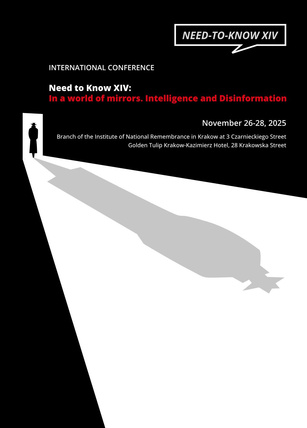The proceedings of the 14th International Conference in the “Need to Know” series, devoted to the history of intelligence and counterintelligence in the twentieth century, will be held on 26–28 November 2025. On the first day, the conference will take place in the conference hall of the historic seat of the Kraków Branch of the Institute of National Remembrance, the remaining two days will be hosted at the Golden Tulip Kraków-Kazimierz Hotel. The language of the conference is English.