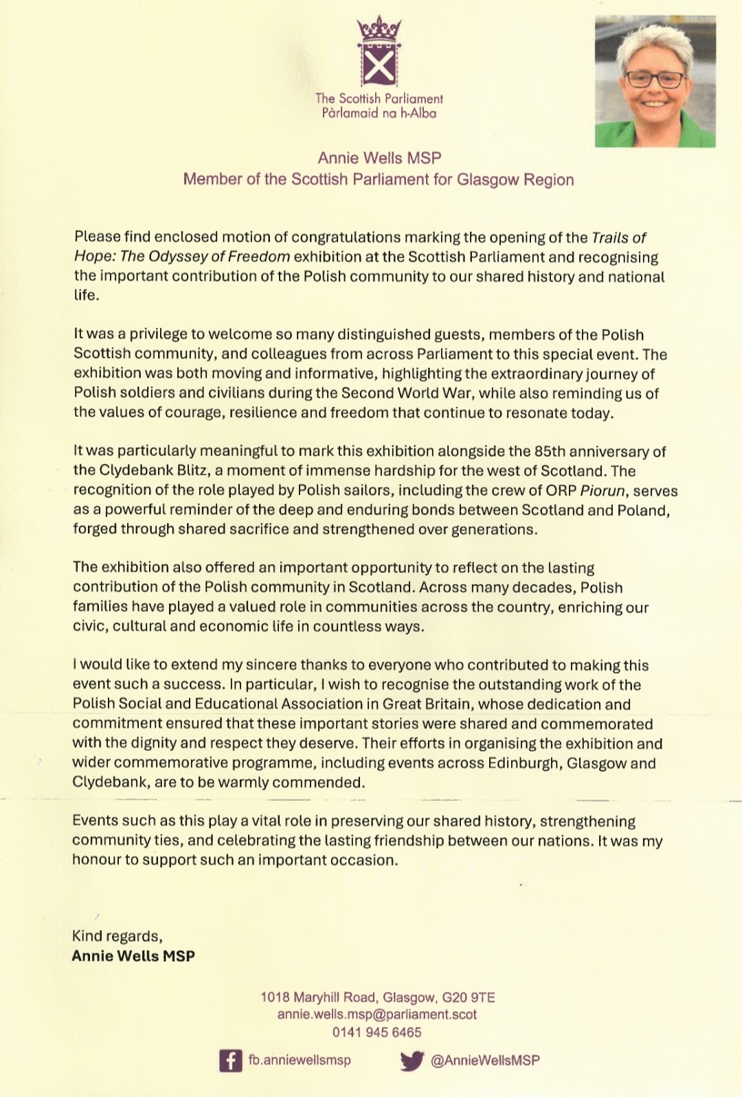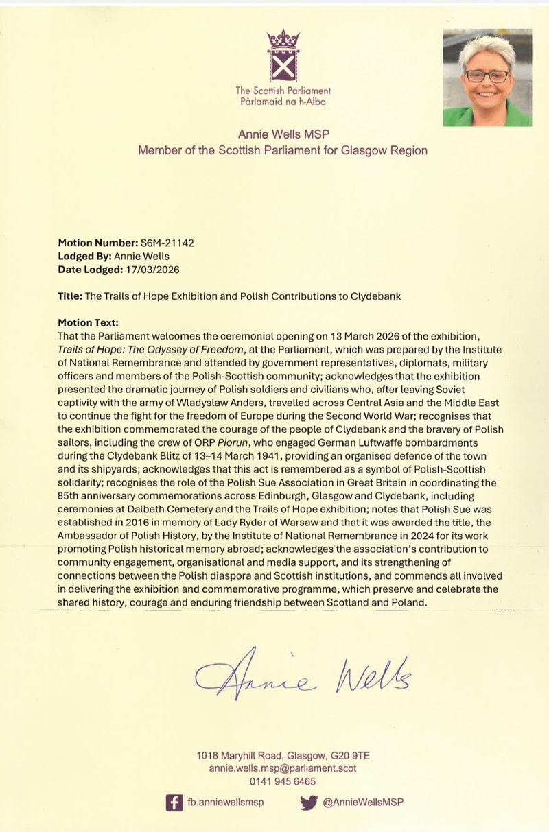 We wish to express our sincere appreciation to Annie Wells MSP for her initiative in bringing forward this motion and for her continued commitment to recognising the historical experiences and enduring contributions of the Polish community in Scotland. Equally significant was her role in enabling the presentation of the “Trails of Hope. The Odyssey of Freedom” exhibition at the seat of the Scottish Parliament, which contributed to a deeper public understanding of the enduring ties between Poland and Scotland and enhanced the exhibition’s educational and commemorative value.