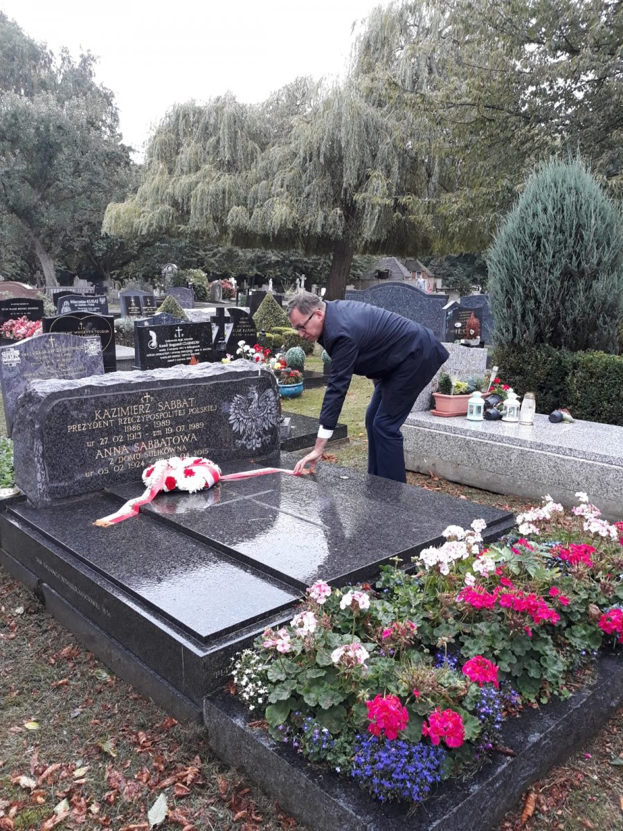 During his stay in London, the President of the Institute of National Remembrance laid flowers at the Gunnersbury Cemetery at the Katyn Monument (the first monument commemorating the victims of the Katyn Massacre in Western Europe) and at the grave of Kazimierz Sabbat, the Polish President-in-Exile (1986-1989), who died of a heart attack on 19 July 1989 after finding out that Wojciech Jaruzelski had been chosen as President.