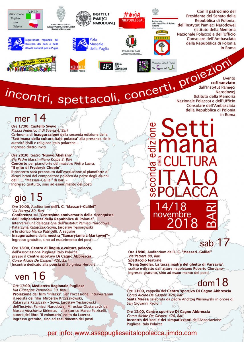The inauguration launching a series of events promoting Polish culture in Italy was attended by the representatives of the upper house of the Polish parliament including Senator Grażyna Sztark, Grzegorz Kozuba, the Deputy Consul of the Embassy of the Republic of Poland in Rome, and Dr Mirosław Obstarczyk from the Auschwitz-Birkenau State Museum in Oświęcim. Professor Antonio Mercurio, the President of the Apulian Italian-Polish Association, greeted guests from Poland extending special thanks to the Institute of National Remembrance for its support of the initiative and providing educational materials for the participants of numerous events planned as part of the Polish-Italian Culture Week.