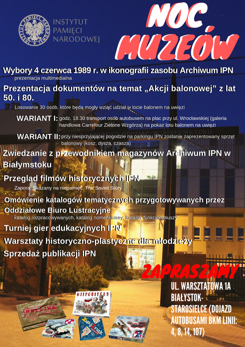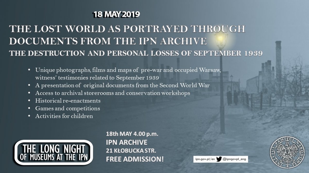 The Archive of the Institute of National Remembrance would like to invite you to its headquarters at 21 Kłobucka str. in Warsaw on Saturday, 18 May 2019 for the next edition of the Long Night of Museums. The event will constitute a unique opportunity to visit archival storerooms, which are not normally accessible for the public, as well as to have a look at archival materials meticulously restored by our conservators.