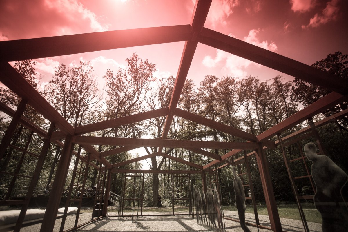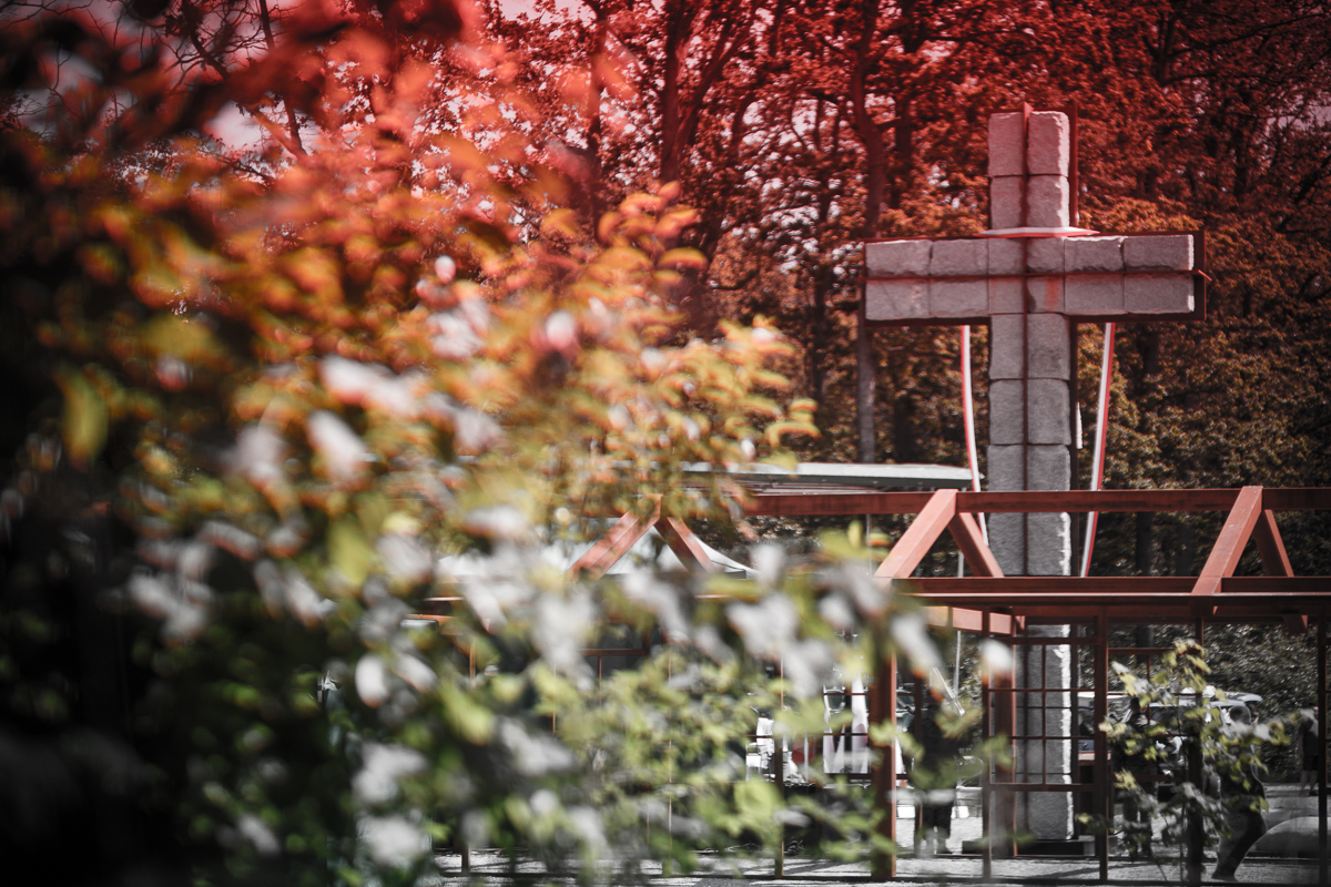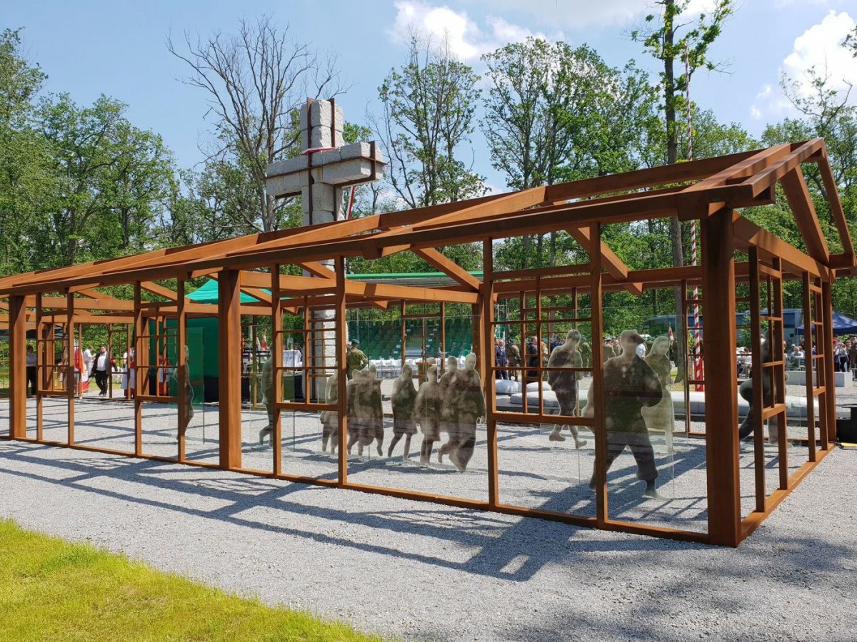 The monument prepared by the Institute of National Remembrance in Stary Grodków consists of a reconstruction of the barrack blown up in the autumn of 1946. Life-size glass boards - figures symbolizing the members of captain Flame’s unit have been placed in its interior. A few-meter long stone cross is located in front of the barrack. The places where the remains of soldiers and artifacts were found, have been marked by symbolic stone graves.