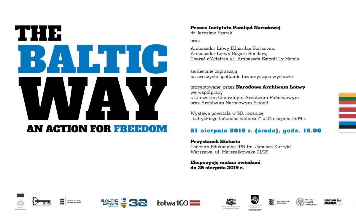 The Institute of National Remembrance would like to cordially send out its invitation to a meeting accompanying the exhibition "The Baltic way – an action for freedom" prepared by the National Archives of Latvia in cooperation with the Lithuanian Central State Archives and the National Archives of Estonia. The meeting will take place on 21 August 2019 (Wednesday) at 6 p.m. at IPN’s Educational Center “Przystanek Historia” The exhibition created on the 30th anniversary of the "Baltic Freedom Chain" of 23 August 1989. It can be visited from 20 July to 26 August 2019 at the IPN’s Educational Center.