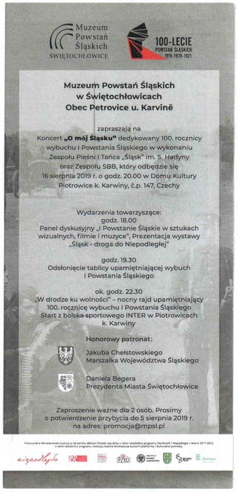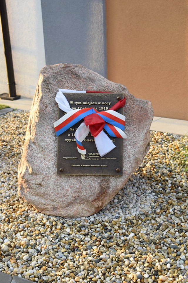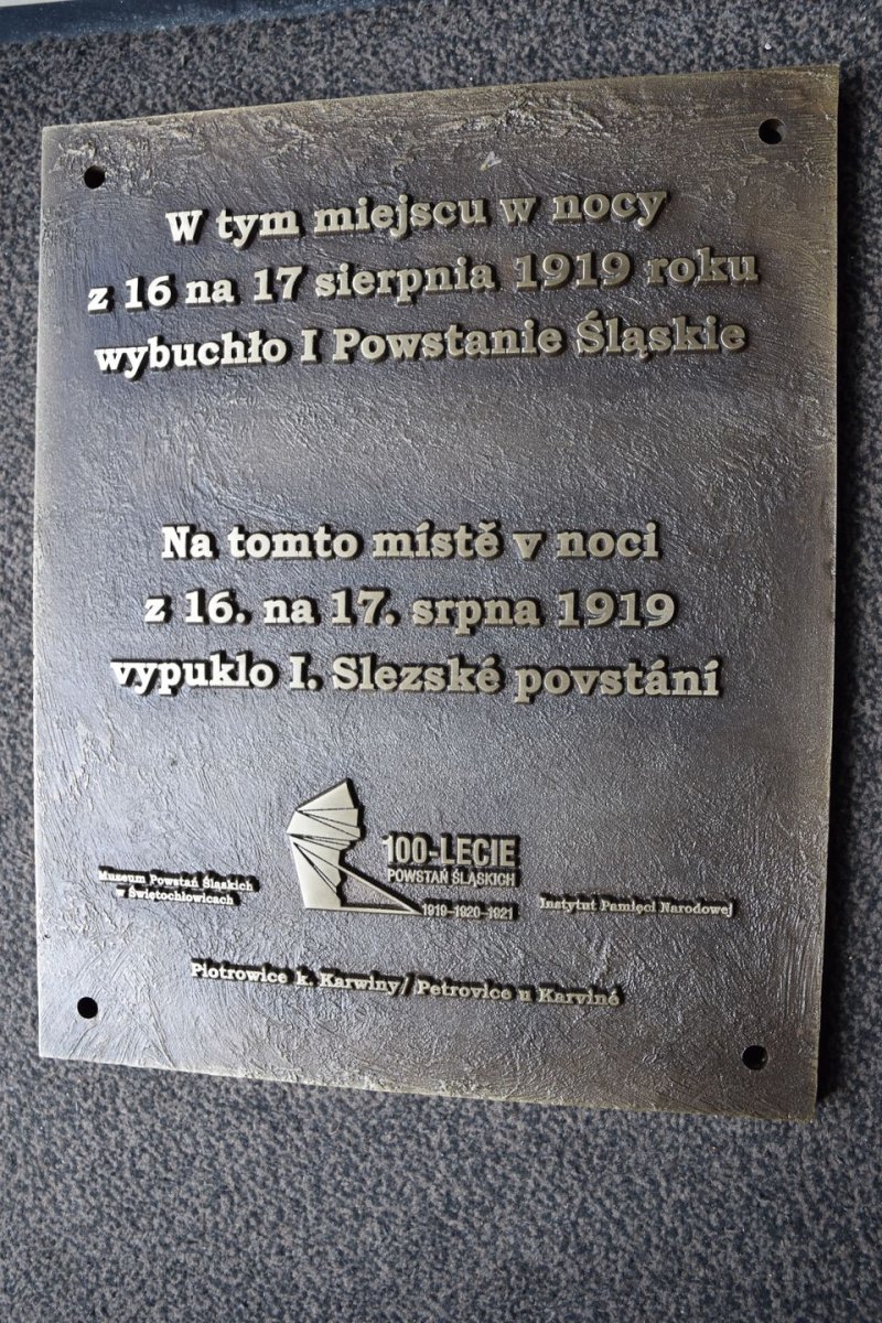 Upon the request of the Silesian Uprising Museum in Świętochłowice, the IPN Branch Office for Commemorating the Struggle and Martyrdom in Katowice funded a plaque commemorating the place of the outbreak of the First Silesian Uprising in Piotrowice near Karviná in the territory of today's Czech Republic. Its unveiling took place on 16 August 2019 in Piotrowice near Karviná (Petrovice at Karviné) in the Czech Republic. This is the first commemoration of the Silesian Uprisings outside Poland carried out by the Institute of National Remembrance.