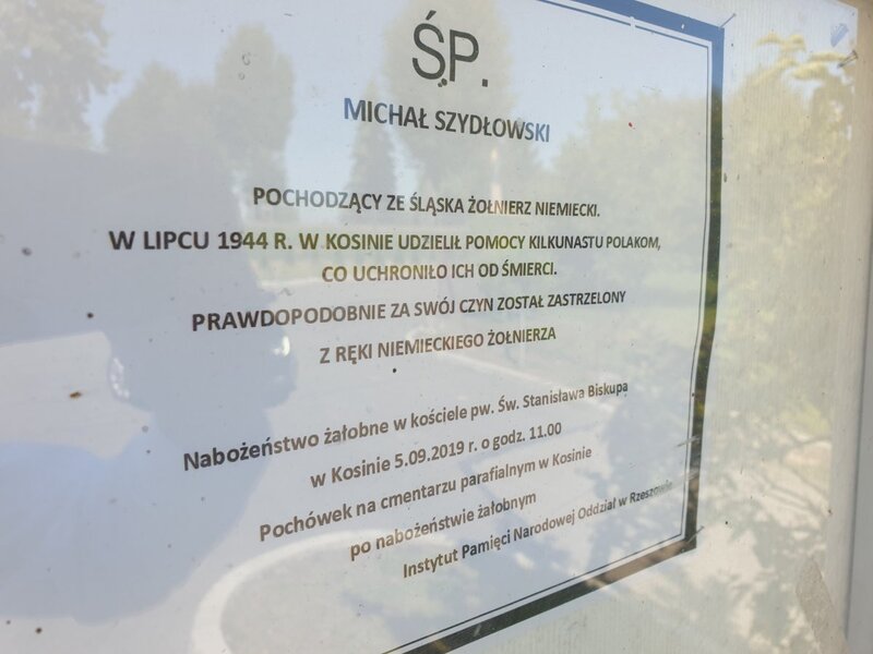 The funeral of Michał Szydłowski, a German soldier from Silesia, who was stationed with his unit in Kosin, took place at the local cemetery on 5 September 2019. Michał Szydłowski defended about 13 Poles who were to be killed. Probably due to a related dispute with a fellow soldier or possibly his commander, he was shot in 1944.