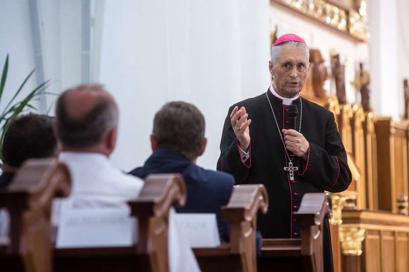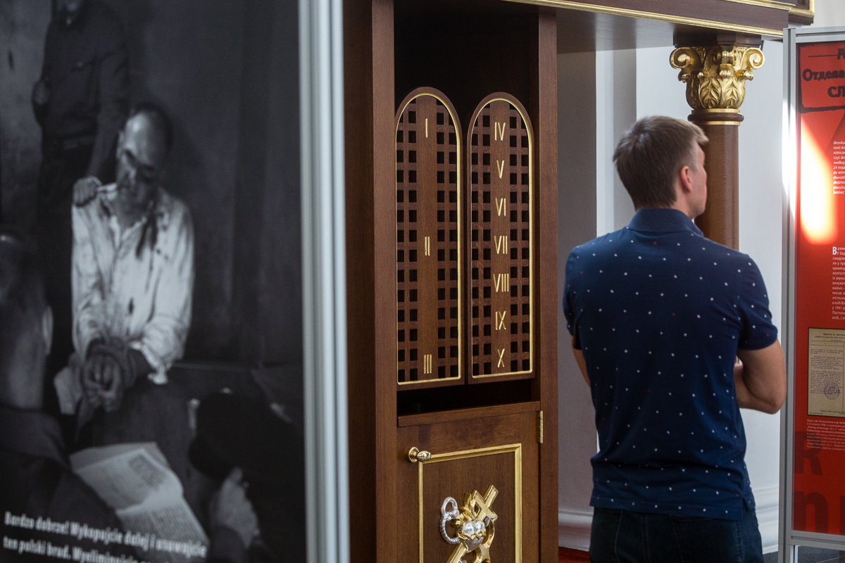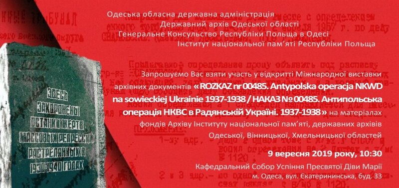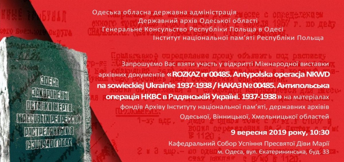 The exhibition "Order No. 00485. Anti-Polish Operation of the NKVD in Soviet Ukraine 1937-1938", prepared by the Archive of the IPN in cooperation with Ukrainian archivists, was officially opened at 10:30 in the Cathedral of the Blessed Virgin Mary in Odessa. The ceremonial opening was conducted jointly by Bishop Bronisław Bernacki, ordinary of the Diocese of Odessa-Simferopol, the President of the IPN Dr Jarosław Szarek, the Consul of the Republic of Poland Andrzej Szmidtke, the Director of the State Regional Archives in Odessa, Petro Łukjanczuk, and the Head of the department of culture in the regional administration Jarosław Reznikow and Paweł Zielony from the Archive of the IPN.