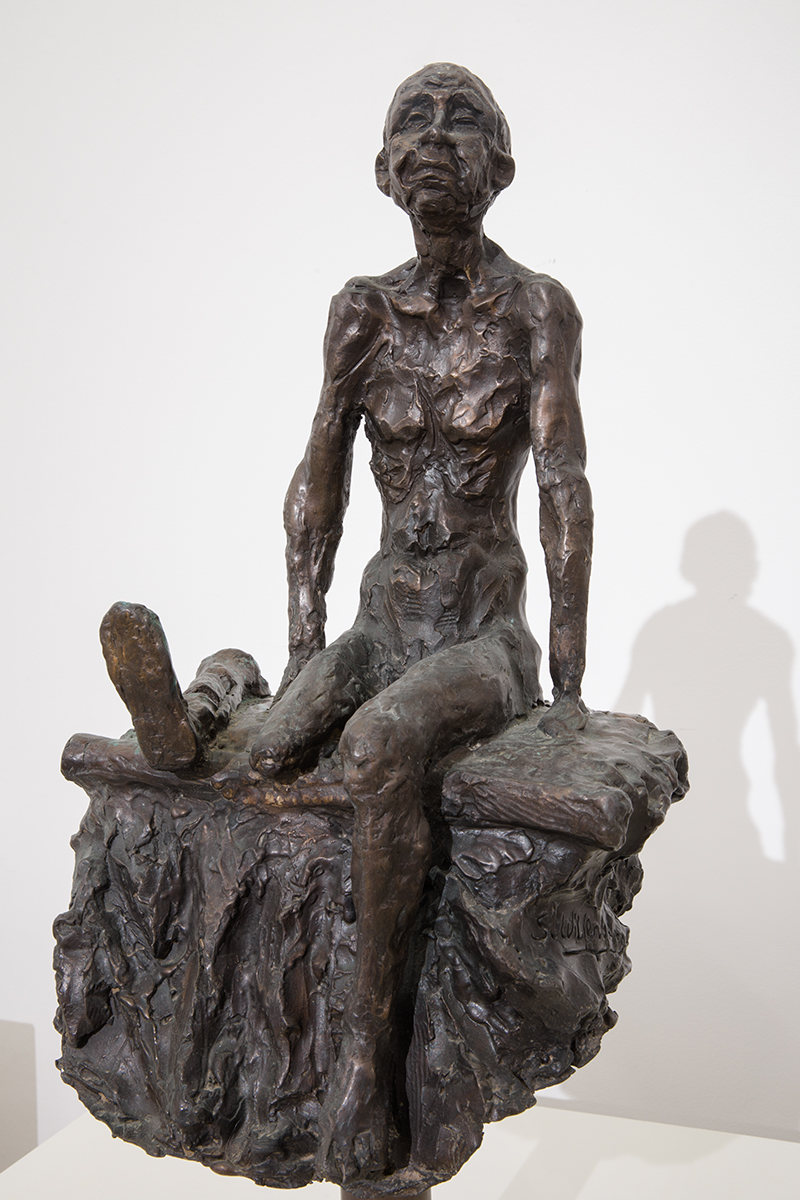 The artist's wife showed the guests around the exhibition, sharing insight into the individual sculptures and the scenes they portray. Particular attention was paid to the sculpture depicting the father unlacing his son’s shoes as this was one of the first things the Germans ordered Jews brought to Treblinka to do. First they had to take off their shoes and tie them together by the shoelaces because the German Reich wanted to use all of the belongings of its victims. During this act, Samuel Willenberg was saved by his friend from Częstochowa. Out of the whole transport of 6, 000 Jews brought in that day, Samuel Willenberg was the only one to survive. The sculpture portrays a particularly touching scene of a barefoot man kneeling on the ground, taking off his son’s shoe.