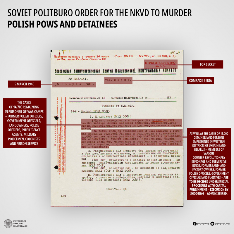 80 years ago, the highest Soviet authorities approved Beria’s proposal to kill Polish POWs and detainees. The approval was issued as the order no. P13/144, and set in motion the preparations for the Katyn Massacre, followed by the transfer to the execution sites.