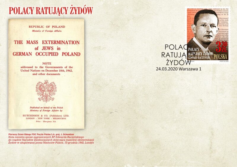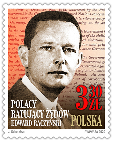 In connection with the Polish National Day of Remembrance of Poles Rescuing Jews under German occupation, on 24 March 2020 the Polish Post will introduce a stamp, an FDC (First Day of Issue cover) envelope and a date stamp for the philatelic publications "Poles Saving Jews". The stamp was prepared in cooperation with the Institute of National Remembrance. This is a continuation of the series started in 2019 with a stamp dedicated to the Ulma family. This year’s issue is dedicated to Polish diplomats, with Edward Raczyński chosen as their representative.