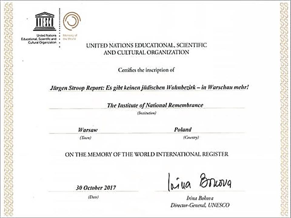 - Jürgen Stroop's report is a unique document illustrating the crime of the Holocaust - the extermination of the Jewish population during World War II. The report is an official document giving an account of how the Germans suppressed the Uprising in the Ghetto in Warsaw - the largest separated residential district for Jews in occupied Europe - and its liquidation in the spring of 1943, said Dr Mateusz Szpytma, the Deputy President of the Institute of National Remembrance, while receiving the UNESCO Memory of the World certificate at the headquarters of the Polish Ministry of Foreign Affairs.