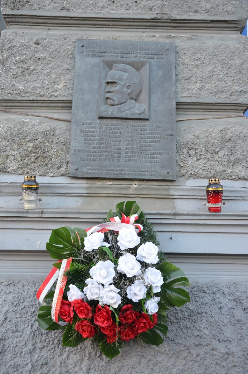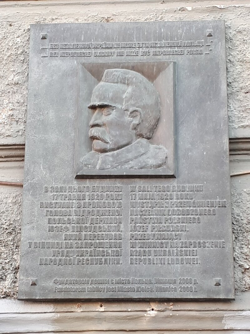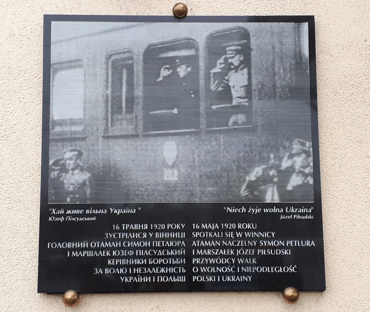The photos commemorate Józef Piłsudski's visit to Vinnitsiya in 1920, and the place of birth of Walery Sławek in the village of Strutynka near Niemyriv in Vinnytsia Oblast in Ukraine.