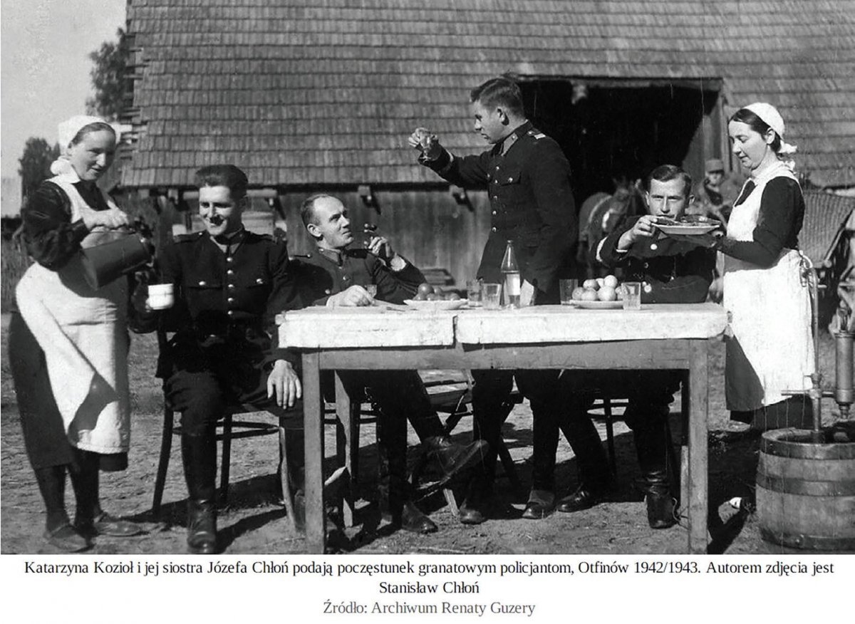 Photo: Katarzyna Kozioł and her sister Józefa Chłoń give a treat to navy-blue police officers, Otfinów, 1942/1943. Photo: Stanisław Chłoń. Source: Renata Guzera’s archive