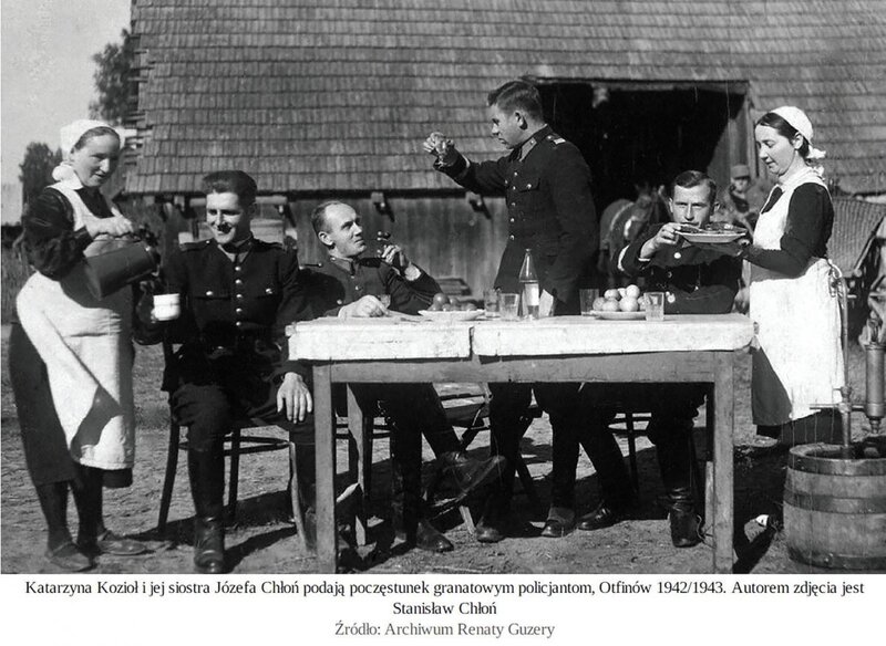 Grabowski writes: "Some photos, as posted on the next page, require discussion and in-depth reflection. Four men in uniforms can be seen behind the table. Two women, festively dressed, who are serving food and drink to the men are standing on each side. Three men are sitting, and one is standing and ̶ with clear respect – is raising his glass, turning towards one of the seated men, who has a slightly indulgent smile. The smiling man is sitting comfortably leaning back, his legs are crossed, and he is smoking a cigar. He is undoubtedly the central figure. Perhaps it is his birthday or name day, perhaps the feast is commemorating his promotion. We do not know that. However, while his comrades are wearing dark blue Polish police uniforms, he is wearing a lighter German military uniform. Then, it is an illustration of the dependence of Poles and Germans serving at one post, and the reflection of the "merging" of Polish policemen into the local community. The undated photo, showing peace and harmony, was probably taken in 1942 or 1943 in Otfinów near Tarnów"[iii].