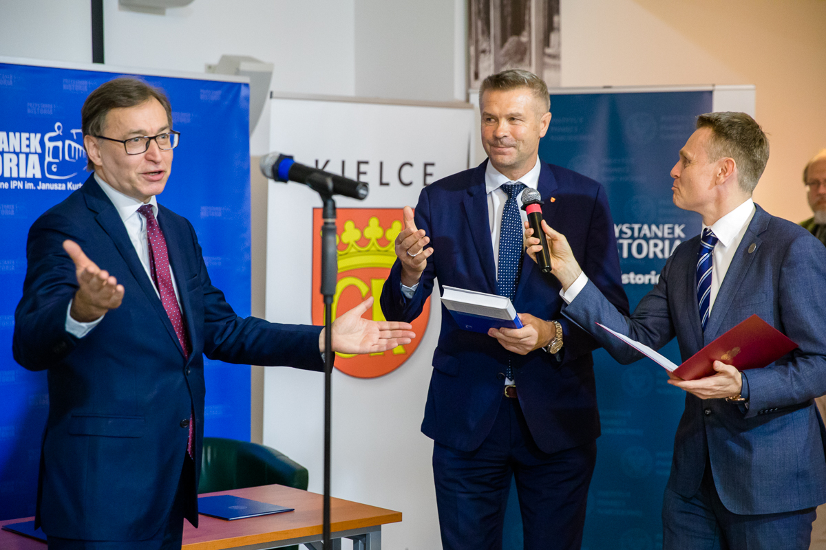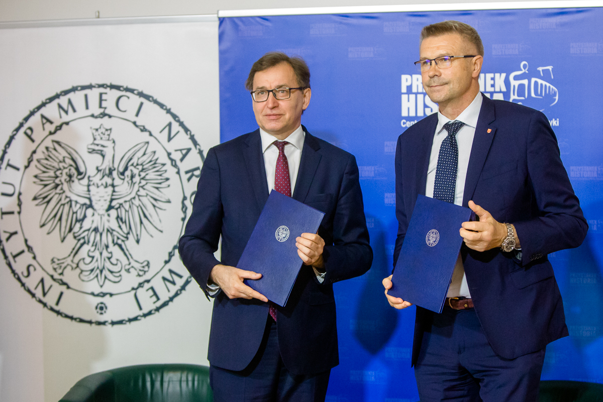 The President of the IPN, Jarosław Szarek Ph.D. and the Mayor of Kielce, Bogdan Wenta, signed a letter of intent regarding cooperation on the commemoration of General Roja at the former German concentration camp in Sachsenhausen. The document was signed during the press conference.