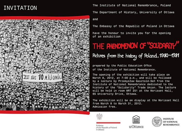 From 8 to 31 March 2012 at the Morisset Hall at Ottawa University, an exhibition “Phenomenon of Solidarity. Pictures from the History of Poland, 1980–1981” is on display. The exhibition was created by the Public Education Office of the Institute of National Remembrance in Poland in August of 2010, for the 30th anniversary of establishing of “Solidarity” Trade Union.