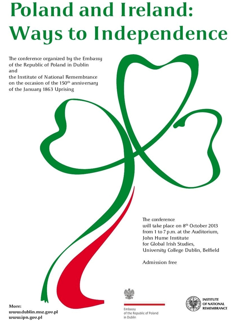 The Embassy of the Republic of Poland in Dublin and the Institute of National Remembrance have organised a conference entitled "Poland and Ireland: Ways to Independence" organized on the occasion of the 150th anniversary of the January1863 Uprising. It took take place on 8 October 2013 in Dublin at Auditorium of the John Hume Insitute for Globar Irish Studies (University College, Dublin, Belfield).
