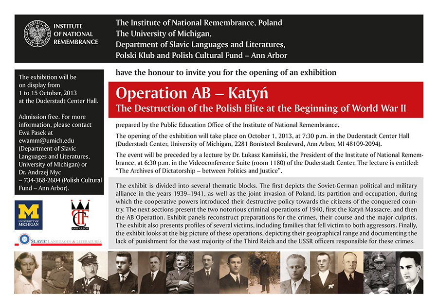 The opening of the exhibition "Operation AB – Katyń. The Destruction of the Polish Elite at the Beginning of World War II" prepared by the Public Education Office of the Institute of National Remembrance took place on October 1, 2013 in the Duderstadt Center Hall (Duderstadt Center, University of Michigan. The event was co-organized by the Institute of National Remembrance, Poland and the University of Michigan, Department of Slavic Languages and Literatures, Polski Klub and Polish Cultural Fund – Ann Arbor.
