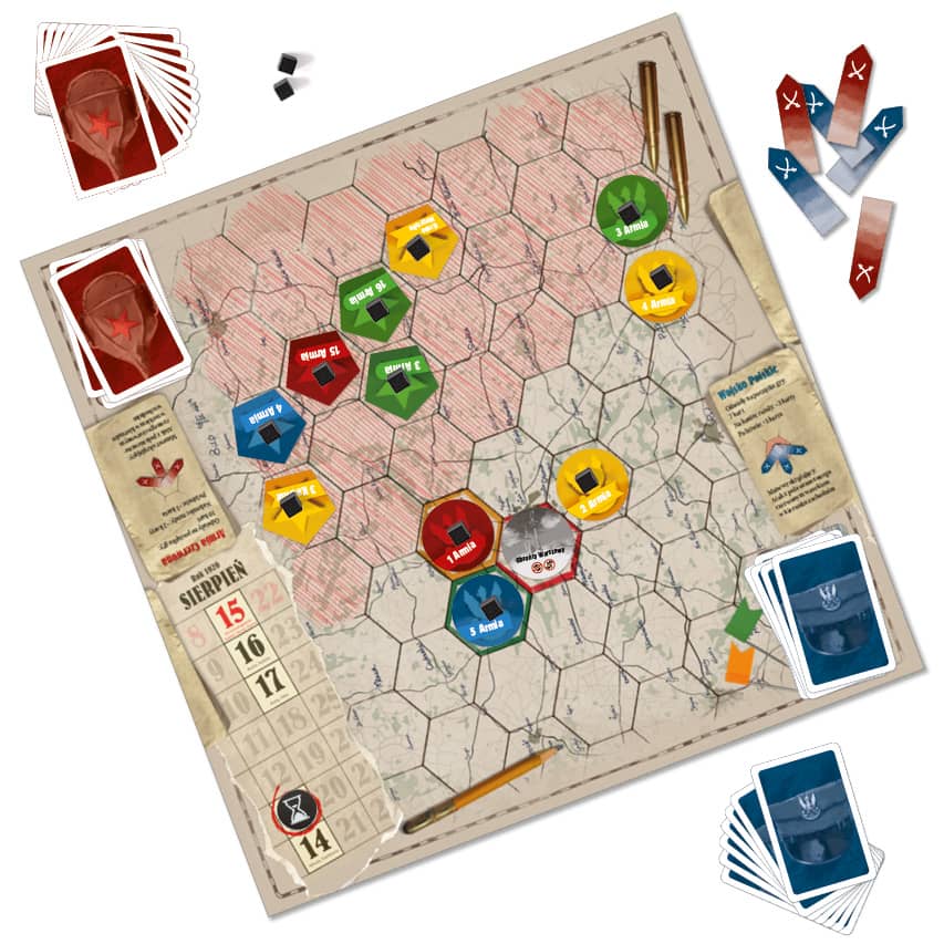 2. 12 army unit tokens: х 6 pentagonal Red Army units х 6 round Polish Army units, including 1 “Obrońcy Warszawy” (Warsaw Defenders) unit.