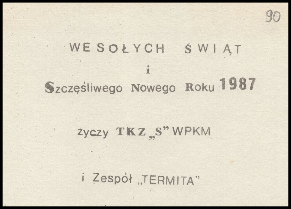 A IPN Ki 288/104 [k. 30] – Christmas card „Pogodnych Świąt 1986 Życzy ZPAP Solidarność Twórców ”. Mirosława i Czesław Janik's private donation -