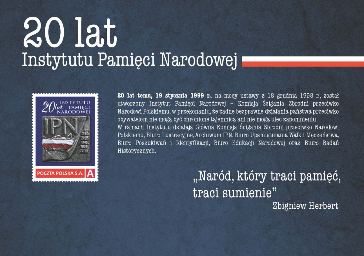 In order to celebrate the 20th anniversary of the establishment of the Institute of National Remembrance, Poczta Polska [the Polish Post] has issued a commemorative stamp with the image of a pin and the most important dates concerning 20th century Polish history: 1918, 1939, 1945, 1980 and 1989.