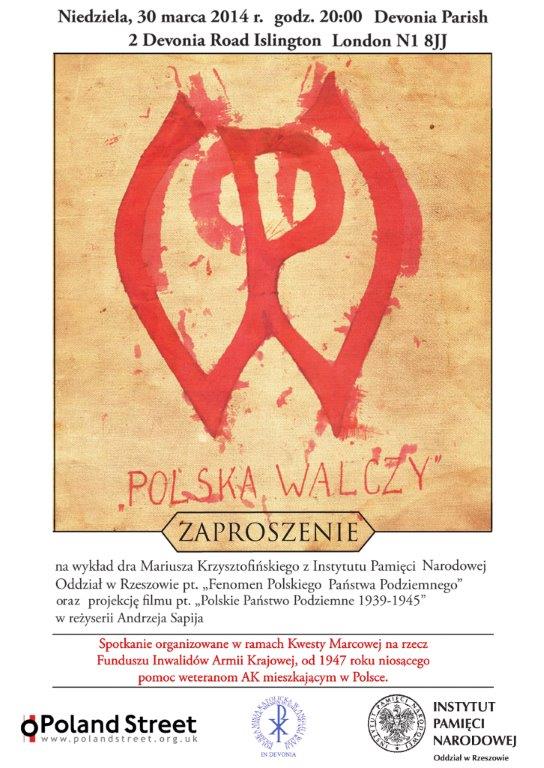 On 30 March 2014, in London (Devonia Parish, 2 Devonia Road, Islington, London N1 8JJ) Mariusz Krzysztofiński of the Rzeszów Branch of the Institute of National Remembrance gave a lecture on "The phenomenon of the Polish Underground State". This was followed by the movie "The Polish Underground State 1939-1945" (directed by Andrzej Sapija).