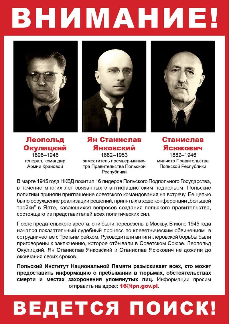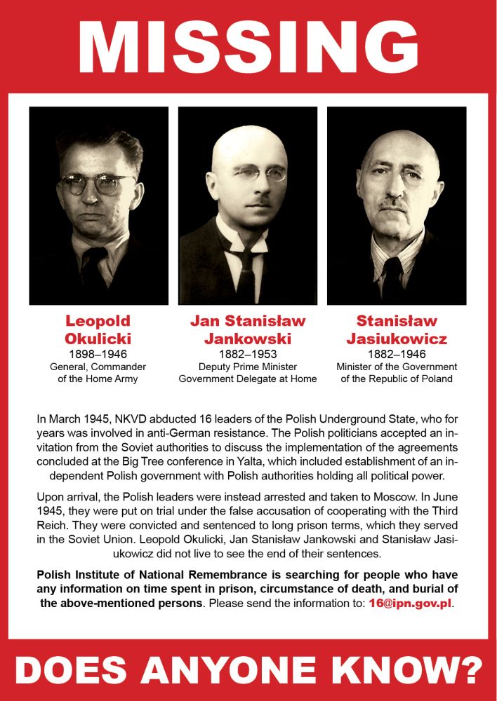 After the Nazi occupation, the kidnapping of Polish leaders was one of the elements of the new enslavement of Poland by another totalitarian regime – this time the Soviet regime. It left no doubt that Stalin was not planning to honour the Yalta arrangements, such as free elections in Poland. In parallel, the new authorities had already launched an extensive campaign of repression, brutally suppressing all manifestations of social independence.