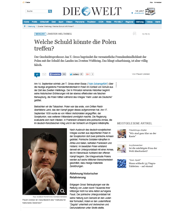 In Die Welt of 16 September 2015 a text of Deputy President of the IPN Paweł Ukielski was published. It is a response to the article by Jan T. Gross entitled „No sense of shame”.
