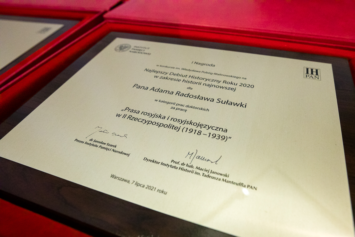 The awarding ceremony for the winners of the 13th edition of the Władysław Pobóg-Malinowski competition "Best Historical Debut of the Year in Poland’s Recent History" took place on 7 July at the IPN’s “History Point” Educational Center in Warsaw (21/25 Marszałkowska Street). The competition is addressed to the authors of unpublished MA theses and doctoral dissertations devoted to the history of Poland and Poles in the 20th century.