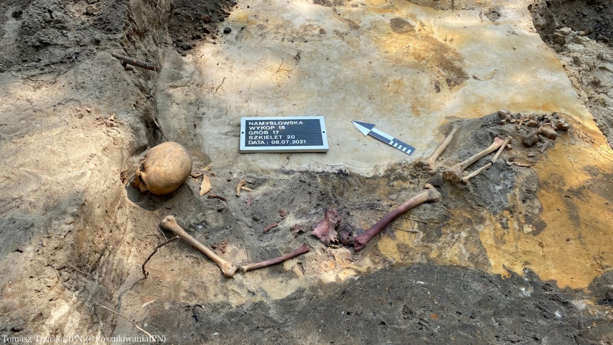 According to a preliminary anthropological assessment, the remains discovered today belong to a man aged 35-45. He was buried without a coffin, in a small burial pit. The arrangement of the remains may indicate that the body was carelessly thrown into the pit. More pits, possibly containing the remains of other people, have been discovered nearby.