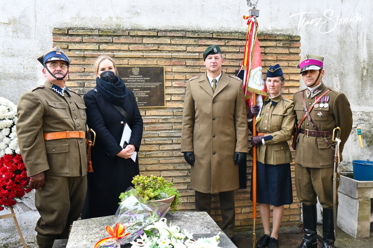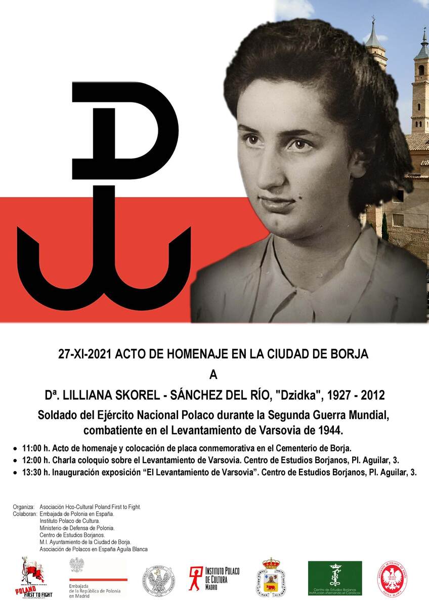 The event began at the municipal cemetery in Borja by commemorating Liliana Skorel, alias "Dzidka", participant of the 1944 Warsaw Uprising, a liaison officer and member of the "Kilinski" battalion. She came to Spain after the war, together with her husband who was from Borja. The national anthems of Poland and Spain were played and a plaque funded by the Polish government was unveiled at her resting place. The Polish and Spanish inscriptions on the plaque read: