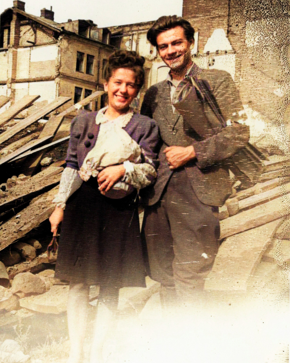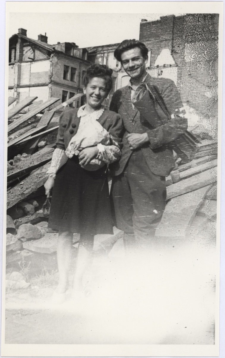 Among the photographs acquired by the IPN Archive, you can also find portraits including one depicting a young couple, dressed in a fashionable, almost festive way. They smile at the camera. She is holding a small bag in one hand and a basket in the other; he is carrying a rolled-up piece of paper, perhaps a poster or a sketch. At first glance they look like random passers-by spotted by a photographer during a walk down a street in Warsaw. It is the background of the picture: piles of ruins behind the couple, that creates a dissonance.