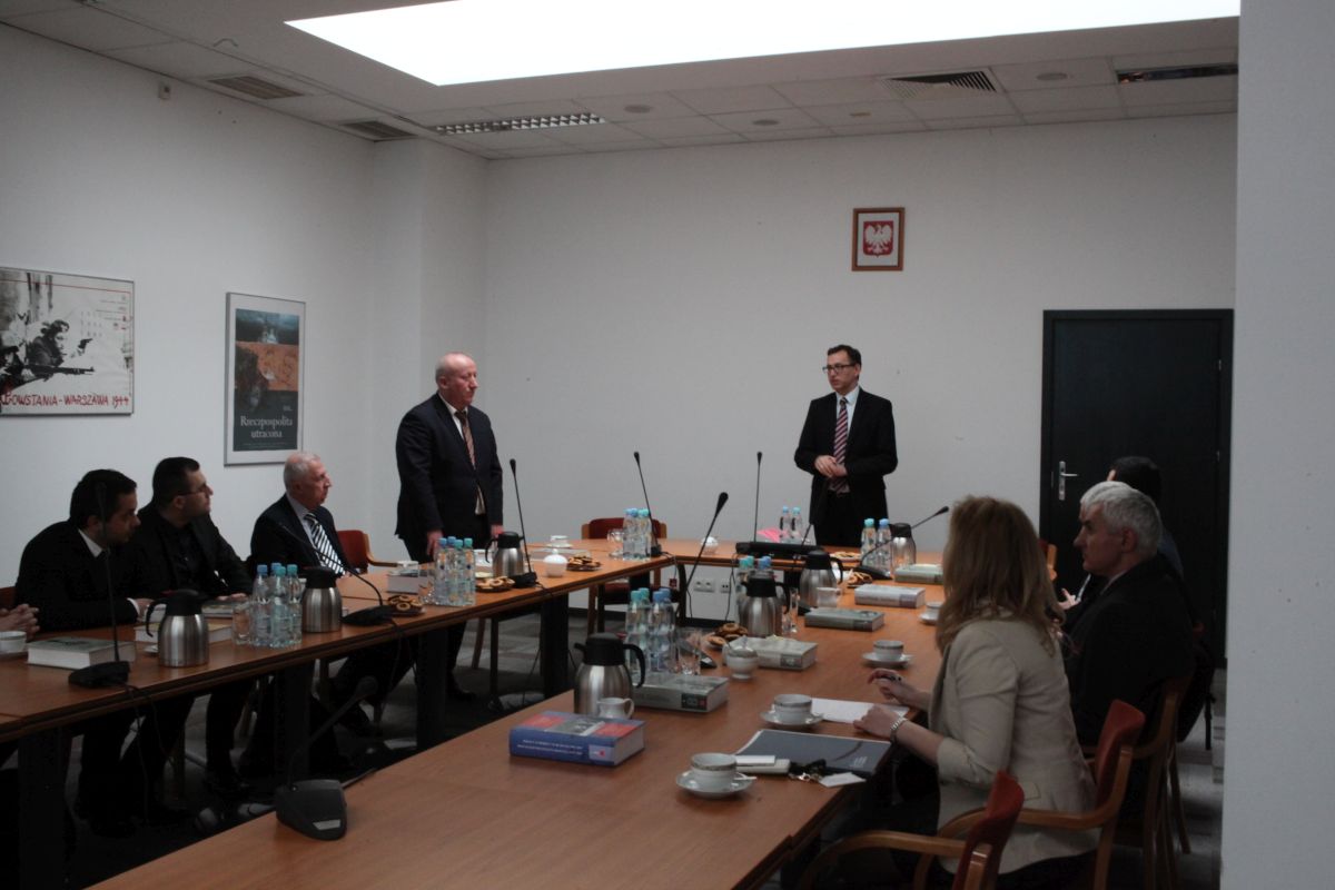 The IPN Archive hosted a delegation of members of the Georgian-Polish Committee of Historians on Wednesday 29 March 2017. On behalf of Georgia, the Committee was represented by : Chairman of the Committee, Dr David Kolbaia (East European Studies University of Warsaw), Zaza Abashidze (Georgian National Center of Manuscripts), Giorgi Astamadze (University of Karlsruhe), Mikheil Bakhtadze (University of Tbilisi), Otar Janelidze (National Museum of Georgia), Beka Kobakhidze (University of Ilya State University in Tbilisi), Giorgi Mamulia (L'École des hautes études en sciences sociales, Paris), Dimitri Silakadze (University of Tbilisi). The guests were accompanied by Dr Paweł Libera, Deputy Director of IPN’s Historical Research Office, who is also a member of the Committee. The visitors had the opportunity to familiarise themselves with the work of particular divisions of the Institute, which was especially important for them in the context of settlements with the communist past in Poland and in Georgia. As scientists, they were also interested in the ways of obtaining documents from the IPN resources, especially those concerning fragments of Polish-Georgian history.