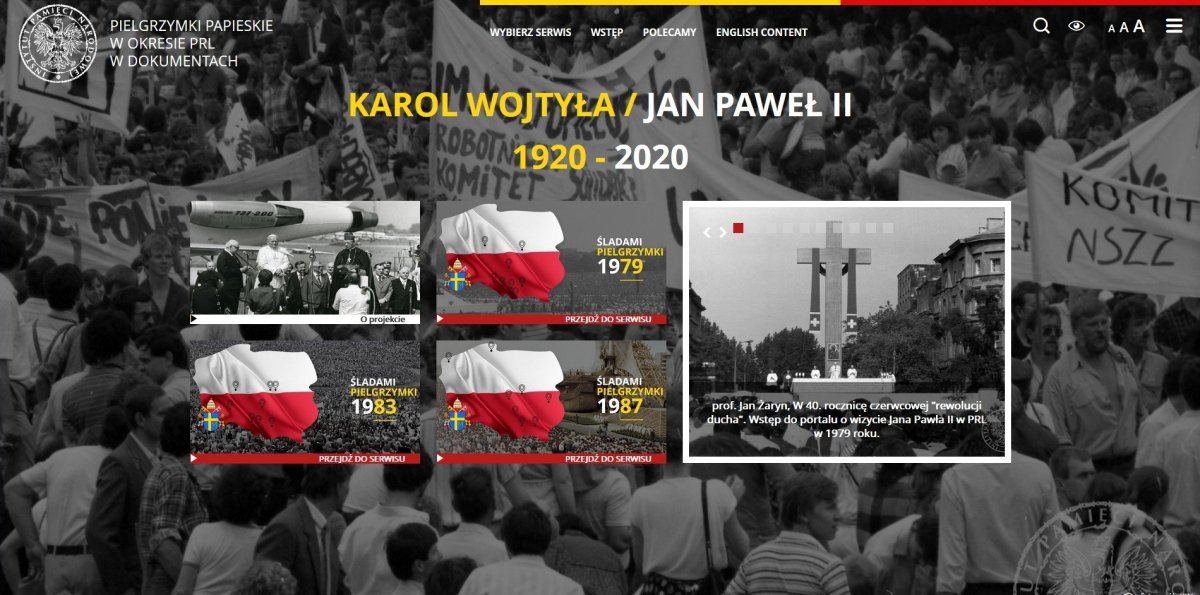 The introduction to the portal has been prepared by Prof. Jan Żaryn. The materials in the "Documents" section were divided according to the stages of the pilgrimage (chronologically from Warsaw to Kraków), according to topics (preparation, Security Services interviews, files, Army documents, polish community press abroad, analyzes and evaluations) and by the specific IPN branches and delegations providing materials. The introductory texts to the individual sets of documents were prepared by the employees of the scientific and archival departments of the IPN from Warsaw, Kraków, Katowice and Poznań.