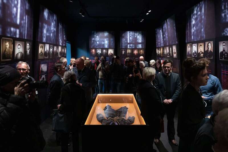 Photos of the victims are on the panels, placed in such a way that they create the impression of an eye contact with the viewer of the exhibition. The effect is deepened by the fact that the panels reflect the visitor. An illuminated uniform chest of a Polish policeman symbolizes a sarcophagus. The sublime character of the exhibition is emphasized by the voice in the background that reads names from the list of Ostashkov prisoners murdered in Kalinin.