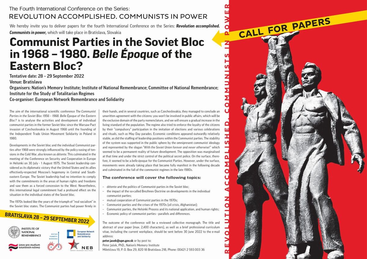 The aim of the international scientific conference The Communist Parties in the Soviet Bloc 1956 – 1968. Belle Époque of the Eastern Bloc? is to analyse the activities and development of individual communist parties in the former Soviet bloc since the Warsaw Pact invasion of Czechoslovakia in Augusta 1968 until the founding of the Independent Trade Union Movement Solidarity in Poland in 1980.